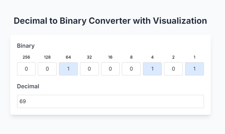 An interactive tool that converts decimal numbers to binary with a clear visual representation of active bits.
